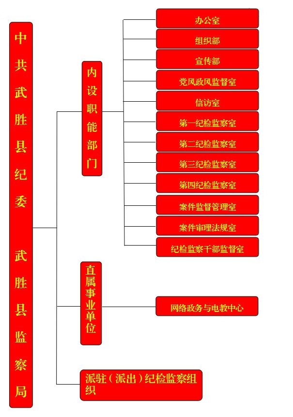 中共武胜县纪委、武胜县监察局合署办公,内设12个职能机构,包括办公室、纪检监察干部监督室、党风政风监督室、案件监督管理室、信访室、纪检监察一室、纪检监察二室、纪检监察三室、纪检监察四室、案件审理法规室、宣传部、组织部。直属事业单位1个,武胜县党风廉政建设宣传教育电教中心。县纪委、县监察局双派驻机构18个,单派驻10个。