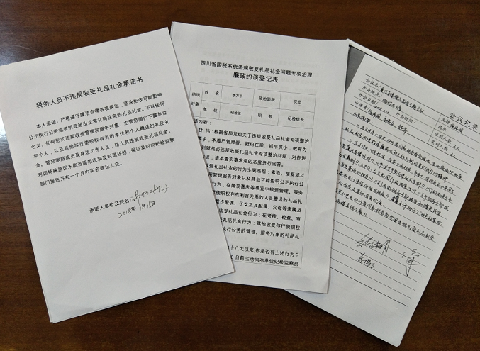 实行全员约谈,全员承诺,认真落实《四川省国家税务局廉政风险防控集中约谈制度》,重点围绕违规收受礼品礼金问题进行约谈提醒。同时干部职工逐一签订《税务人员不违规收受礼品礼金承诺书》,在一定范围内公示,确保税务人员践诺全覆盖、干部群众监督无死角。截至目前,已开展多层次全覆盖式约谈提醒 79人次、承诺79人次。